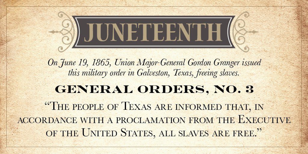 What is the significants of Juneteenth? President Abraham Lincoln freed the slaves in Emancipation Proclamation on January 1, 1863, stating slaves were freed in the rebellious states. He did this in the third year of the civil war. Texas didn’t inform their slaves until General Gordon Granger arrived in Galveston, Texas delivering General Order No. 3 on June 19, 1865 freeing all slaves. It’s been rumored the first messenger was killed.