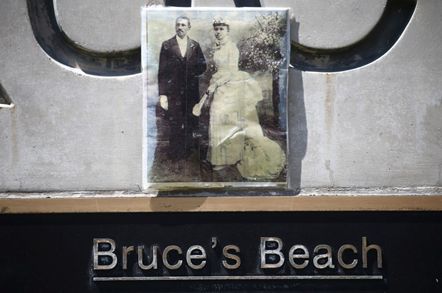 A photo of Charles and Willa Bruce is attached to a plaque marking Bruce’s Beach. Mario Tama